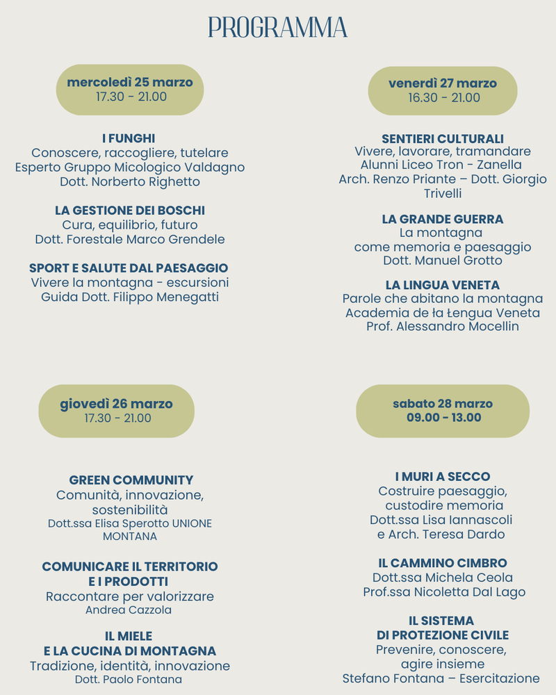 A rendere l’esperienza ancora più completa, dal 15 marzo al 17 maggio verranno proposte anche delle escursioni guidate sul territorio dell’unione: le guide ambientali locali accompagneranno cittadini e appassionati alla scoperta di sentieri e percorsi montani, offrendo occasioni di conoscenza diretta e di immersione nel paesaggio. Le escursioni interesseranno diversi Comuni dell’Unione Montana — Santorso, Piovene Rocchette, Valdagno, Posina, Monte di Malo, Torrebelvicino, Recoaro Terme, Schio e San Vito di Leguzzano.